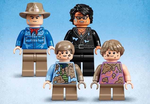 - 4 LEGO® minifigura és egy T-Rex – Alan Grant, Ian Malcolm, Tim Murphy és Lex Murphy, valamint egy beállítható T-Rex figura kelti életre a jelenetet