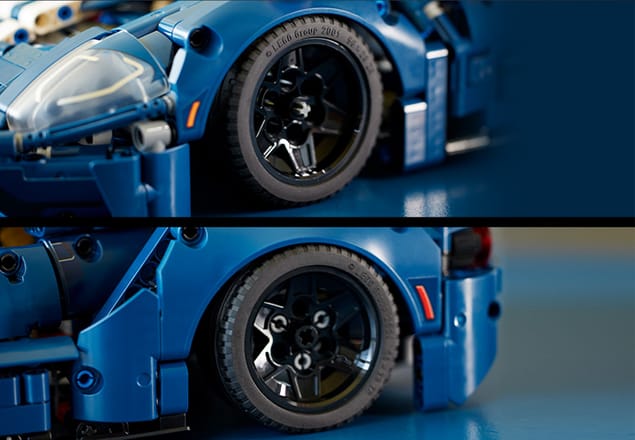 - Indítsd be a motort – A Ford GT modellkészlet részleteit a valódi autó ihlette. Ilyen például a mozgó dugattyúkkal ellátott V6-os motor, a kerekek önálló felfüggesztése és az elsőtengelyes kormányzás